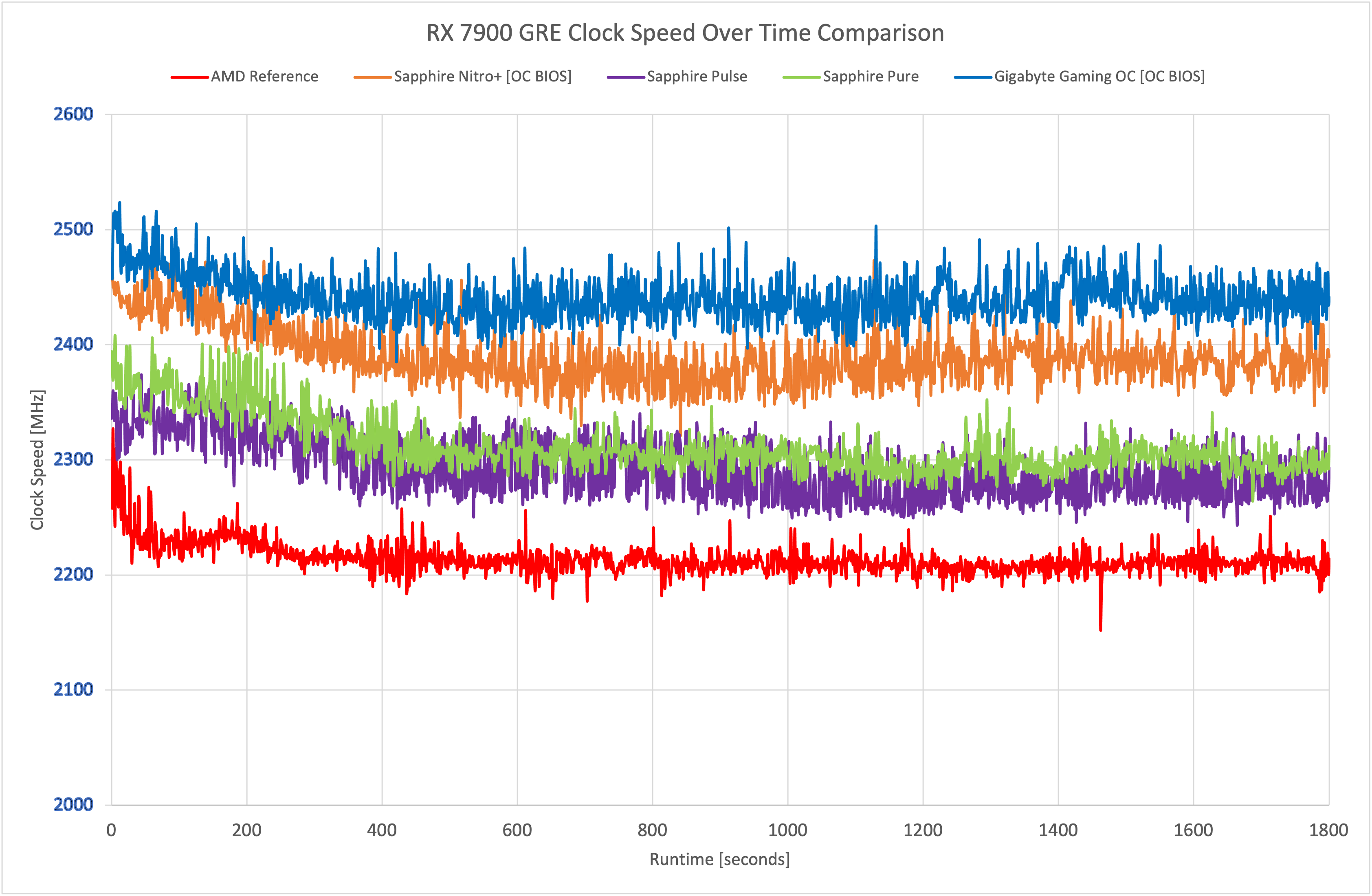 It's interesting that despite the Nitro+ running the fastest in our game benchmarks, over our 30-minute stress test, the Gigabyte Gaming OC averaged the highest clock speed – hitting 2441MHz, so that's over 200MHz faster than the AMD reference model. The Nitro+ wasn't far behind though, hitting 2390MHz, while the Pure came next, followed by the Pulse, which was still about 80MHz ahead of the reference design.