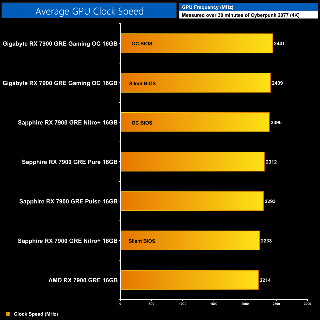 Here we present the average clock speed for each graphics card while running Cyberpunk 2077 for 30 minutes. We use GPU-Z to record the GPU core frequency during gameplay. We calculate the average core frequency during the 30 minute run to present here.