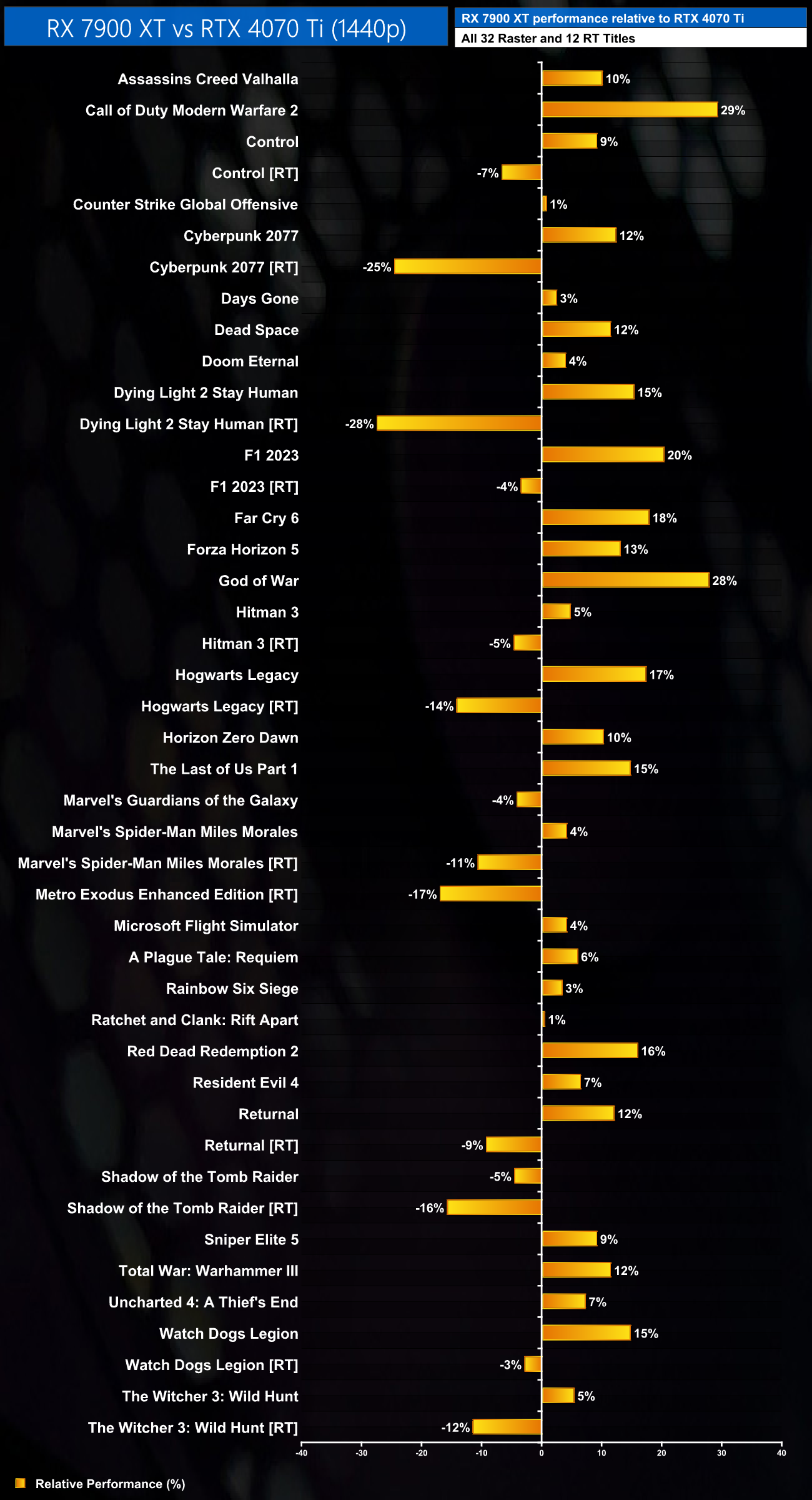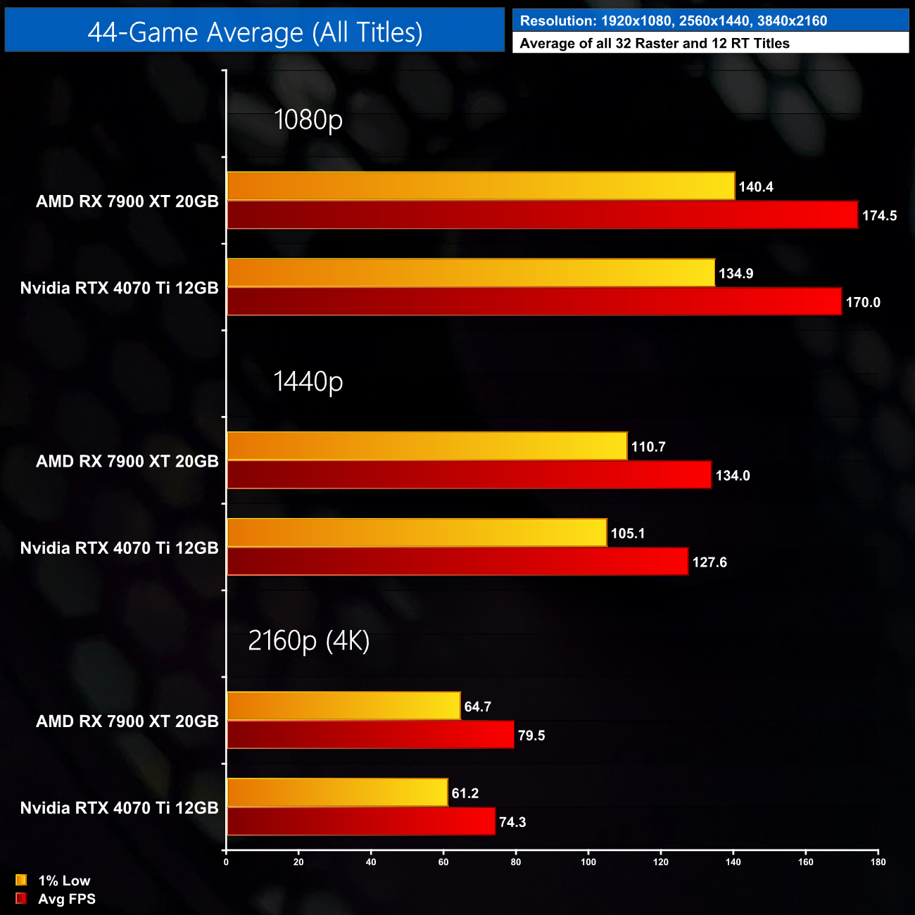 The preceding four pages of this article show each and every one of the 44 games tested, but for an easily-digestable performance summary we have compiled the above charts. What we can see may surprise you, but things are very close indeed between the RX 7900 XT and RTX 4070 Ti over those 44 games. At 1440p, the 7900 XT comes in just 5% faster on average, and 4K that margin is only 7% in favour of the Radeon GPU.
