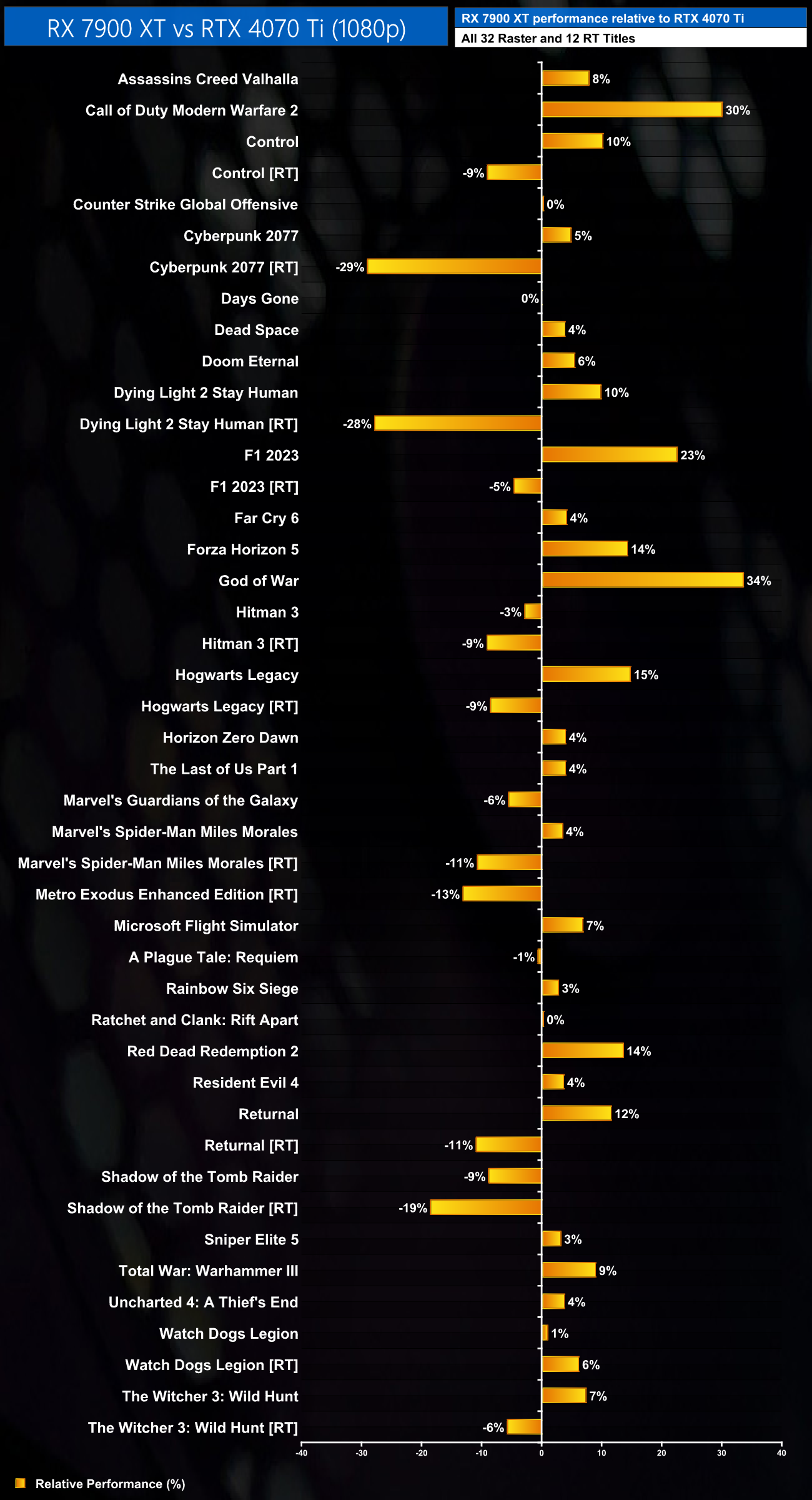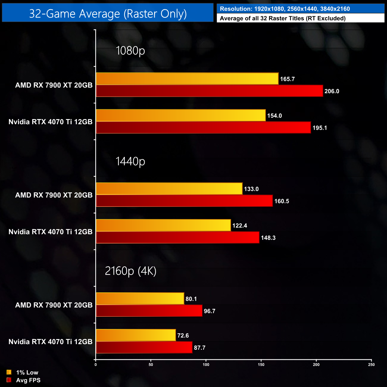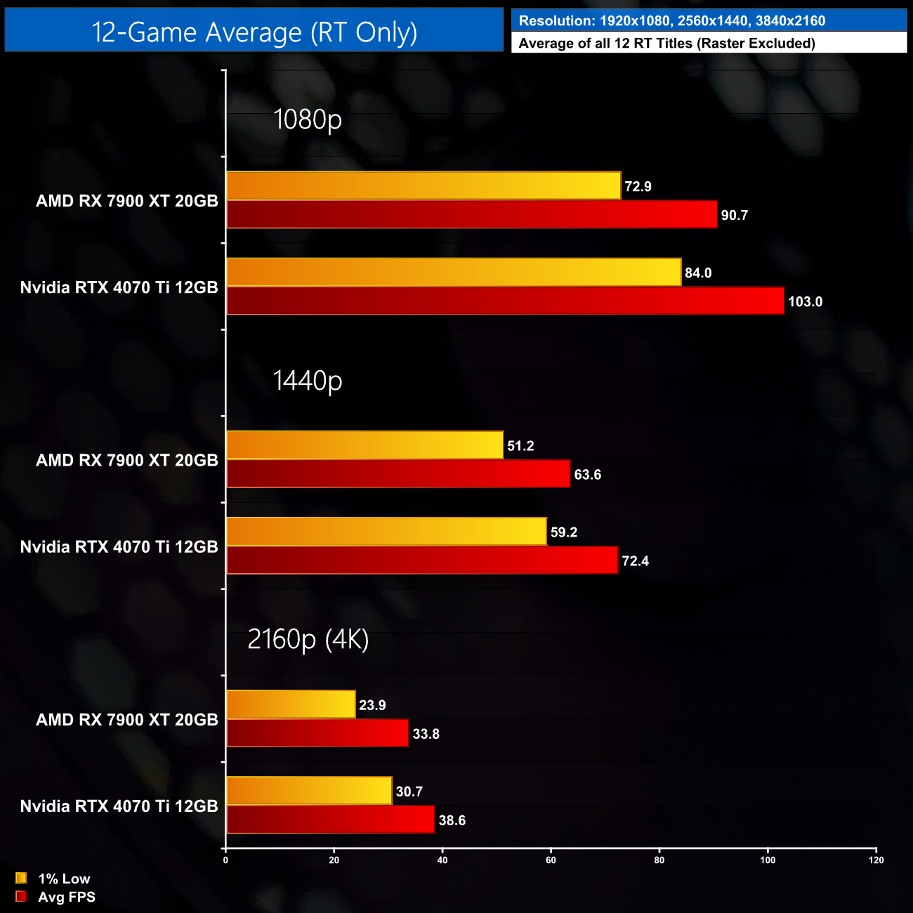 Just for interest as well, if we only look at the 12 games that we tested with ray tracing enabled, the 7900 XT comes in 12% slower on average at every resolution tested, so it’s clearly behind the 4070 Ti here, but it's not a huge difference overall.