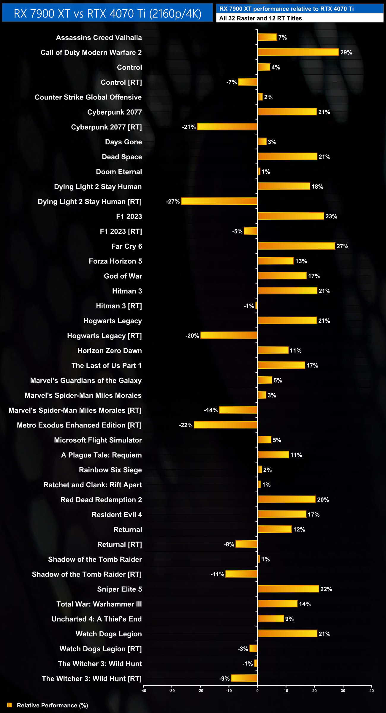 As for 4K, we already know that 4070 Ti falls off at this resolution due to its limited memory bandwidth, but it’s interesting to see that now there’s a total of 19 games where the 7900 XT is at least 10% faster than the 4070 Ti. The only games where it’s slower by more than a 2% margin are ray traced titles, with the heaviest loss coming in Dying Light 2.