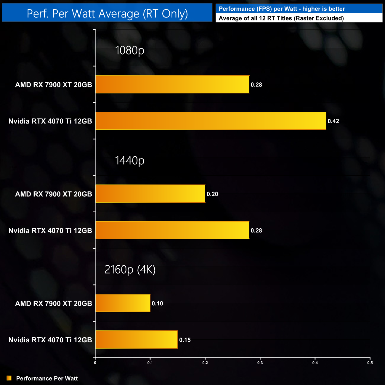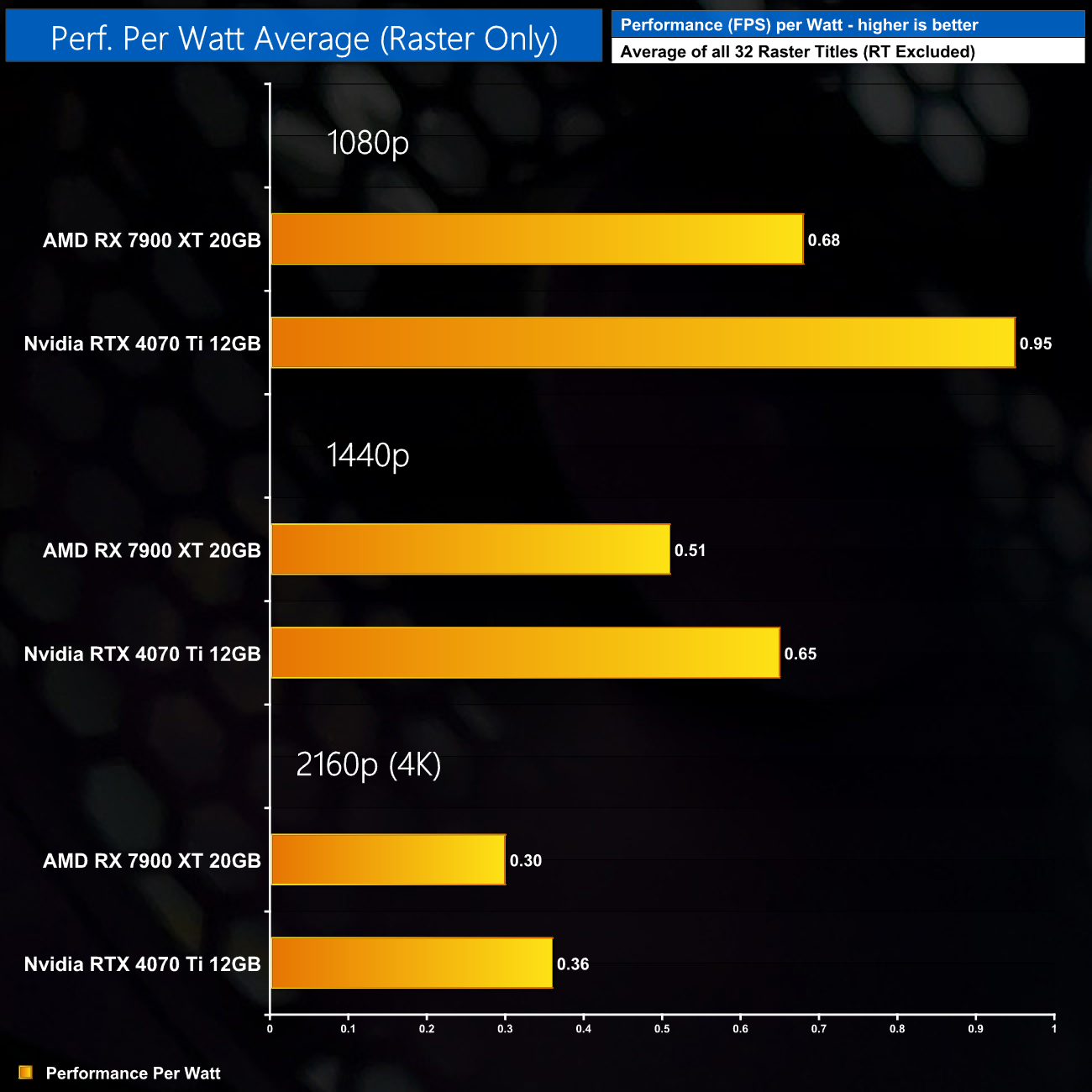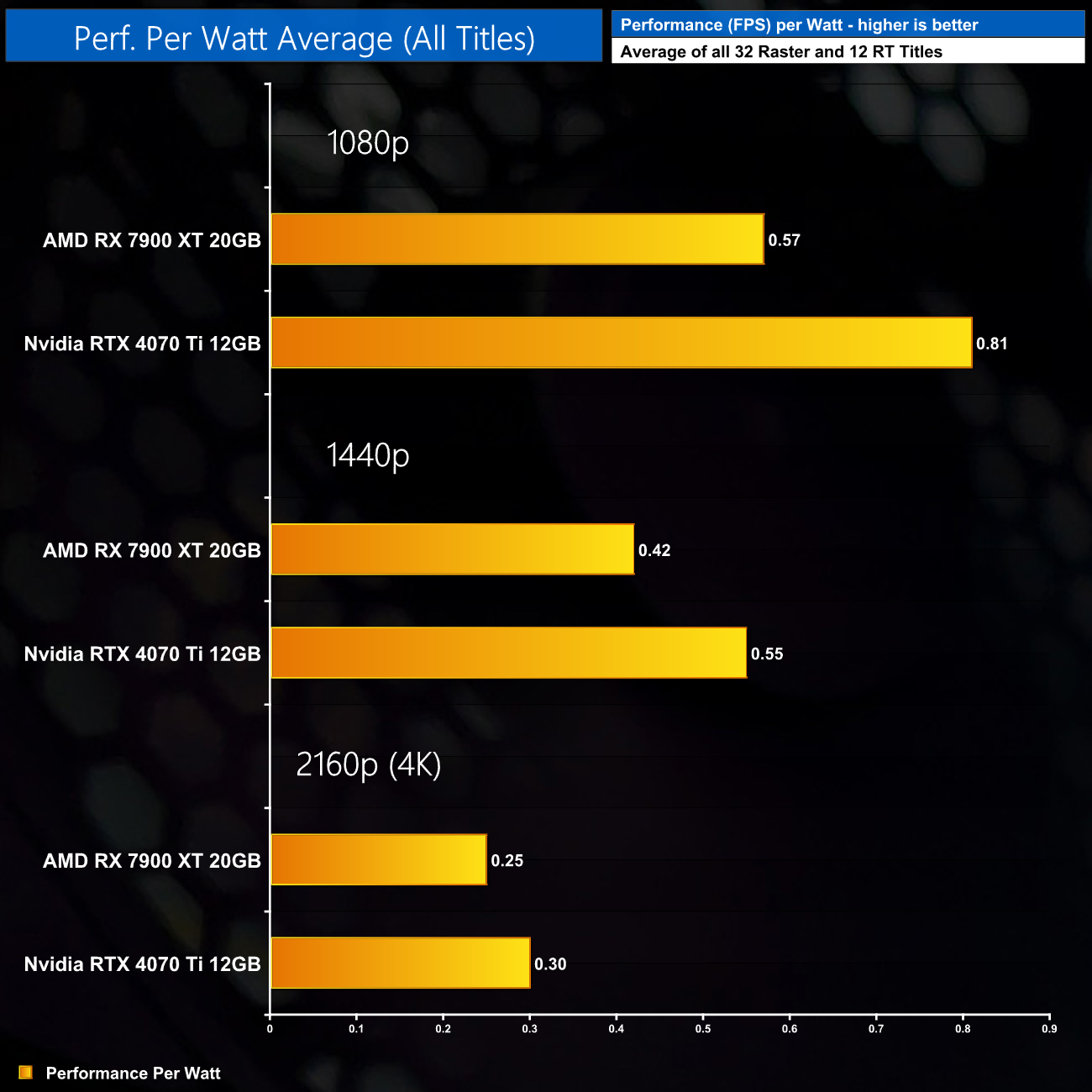 Considering those rather large differences in power, it quickly becomes clear that the 4070 Ti is significantly more efficient. The above charts show performance per Watt for each GPU – or how many frames are rendered per Watt. At 1440p for instance, the 7900 XT is actually 24% less efficient than the 4070 Ti. It does narrow the gap at 4K, but still remains 17% less efficient, something which is well worth factoring into any final buying decision.