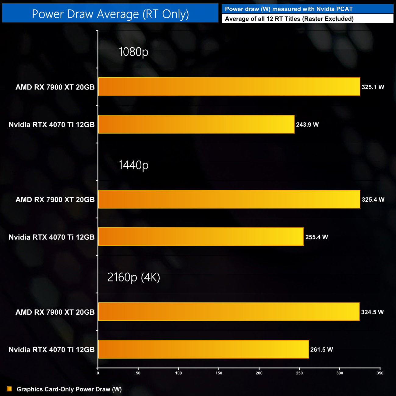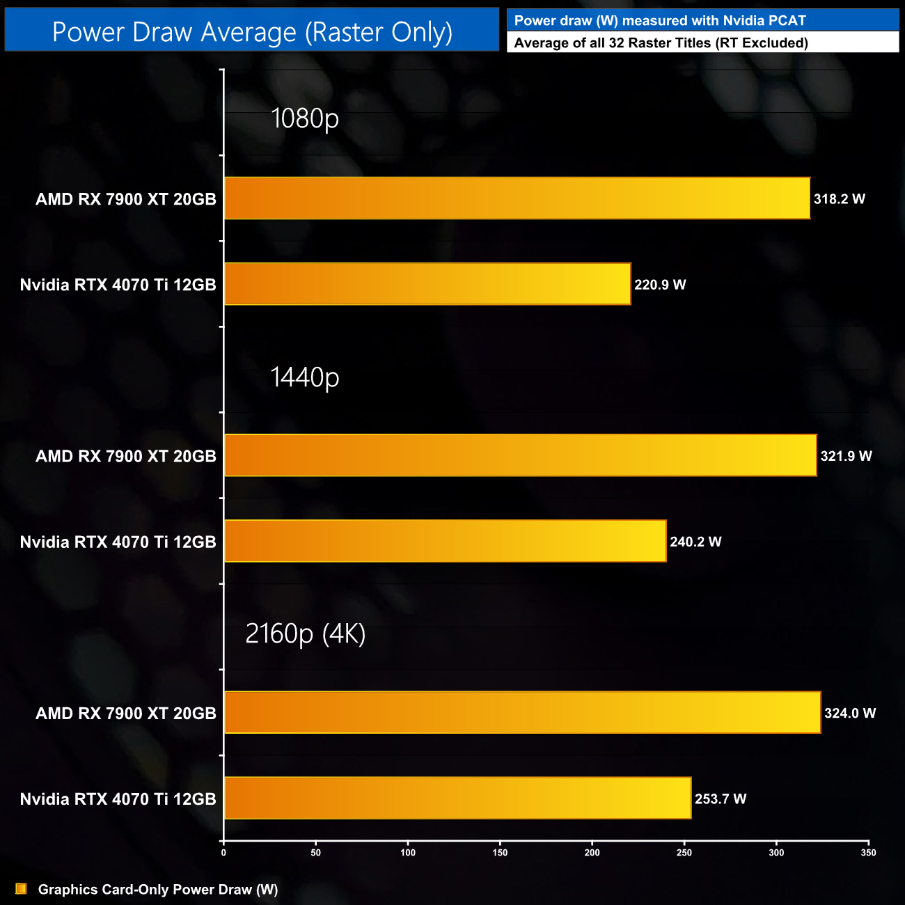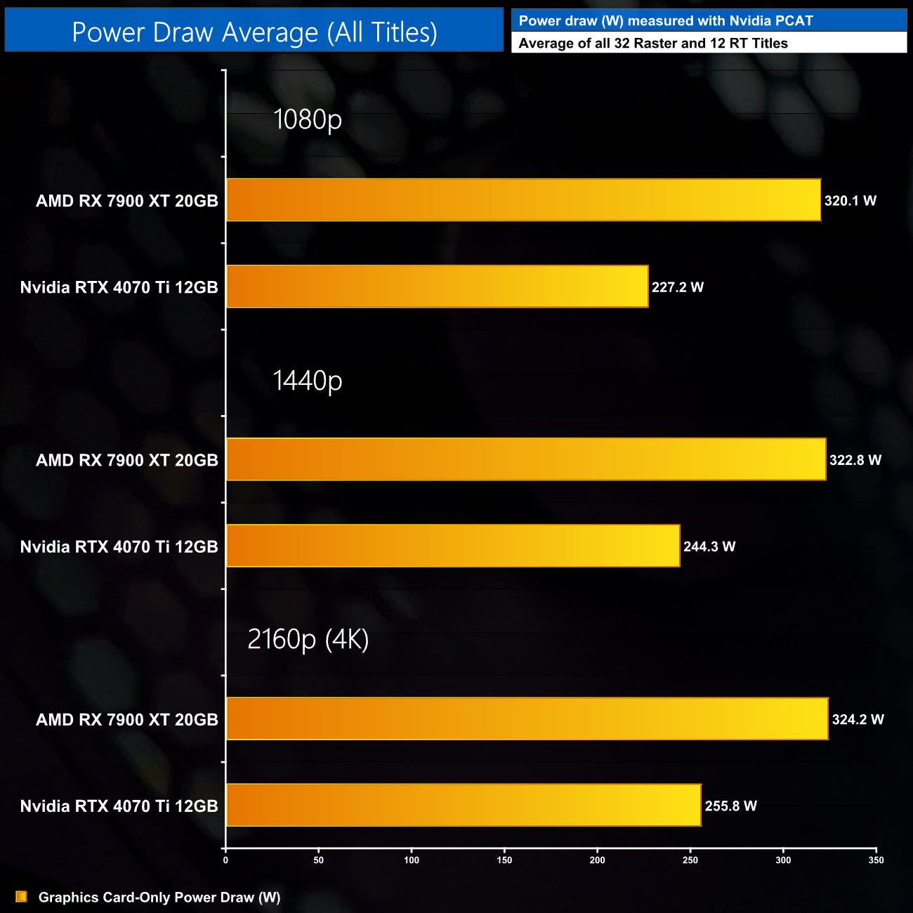 As you can see, there are some substantial differences in power draw between the two GPUs. The RX 7900 XT almost always drew between 320 and 325W of power regardless of the resolution. The 4070 Ti is much less power hungry though, particularly at 1080p and 1440p, where it drew less than 250W on average. Even at 4K, the average power draw is below 260W, or about 70W lower than the RX 7900 XT.