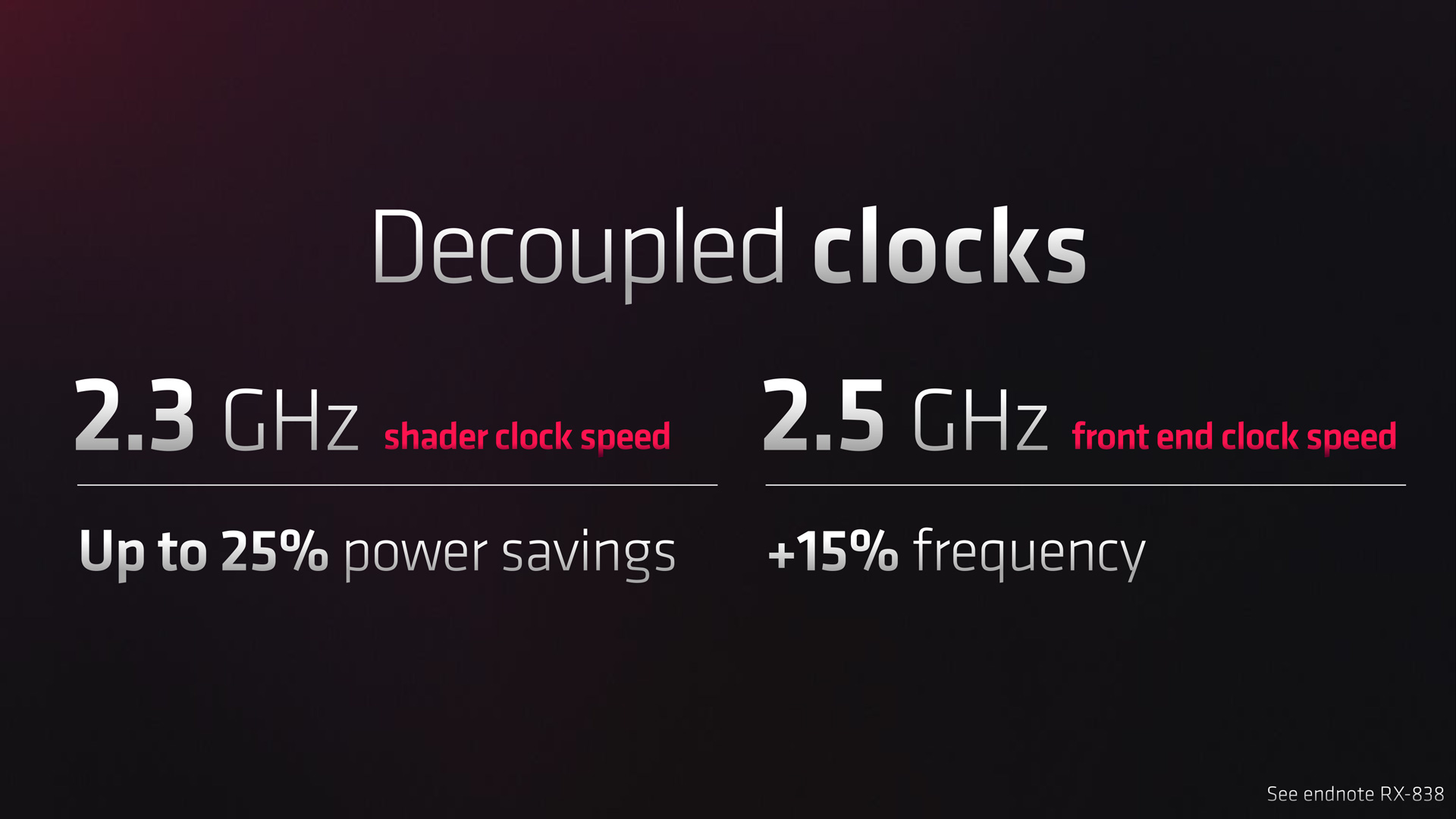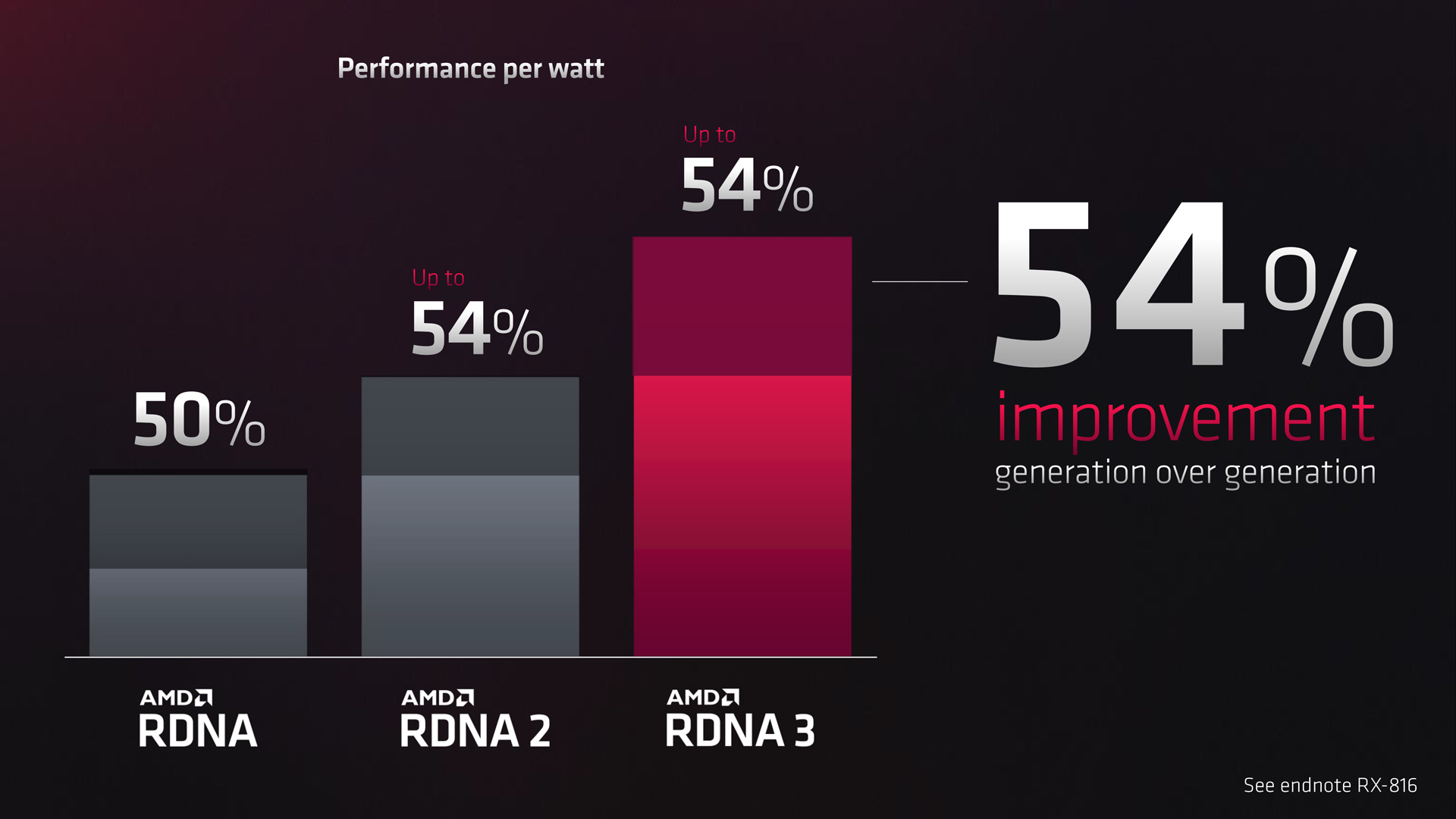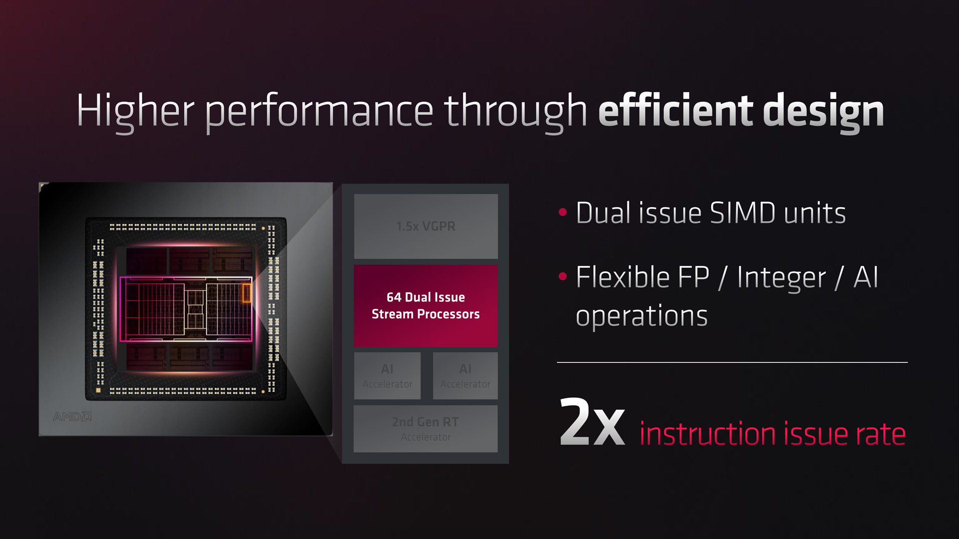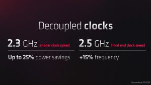 Another change designed to improve efficiency comes with the move to decoupled clock speed. Instead of a single clock speed across the entirety of the GPU, RDNA 3 sees the Stream Processors clocked at 2.3GHz (for the 7900 XTX), supposedly the sweet-spot for the shaders, while the front-end clock is rated at 2.5GHz. What this will mean for overclocking remains to be seen, but AMD claims a 25% power savings from this move. Overall, RDNA 3 is slated to offer a 54% improvement to performance per Watt versus RDNA 2, something I look forward to analysing in my full review.