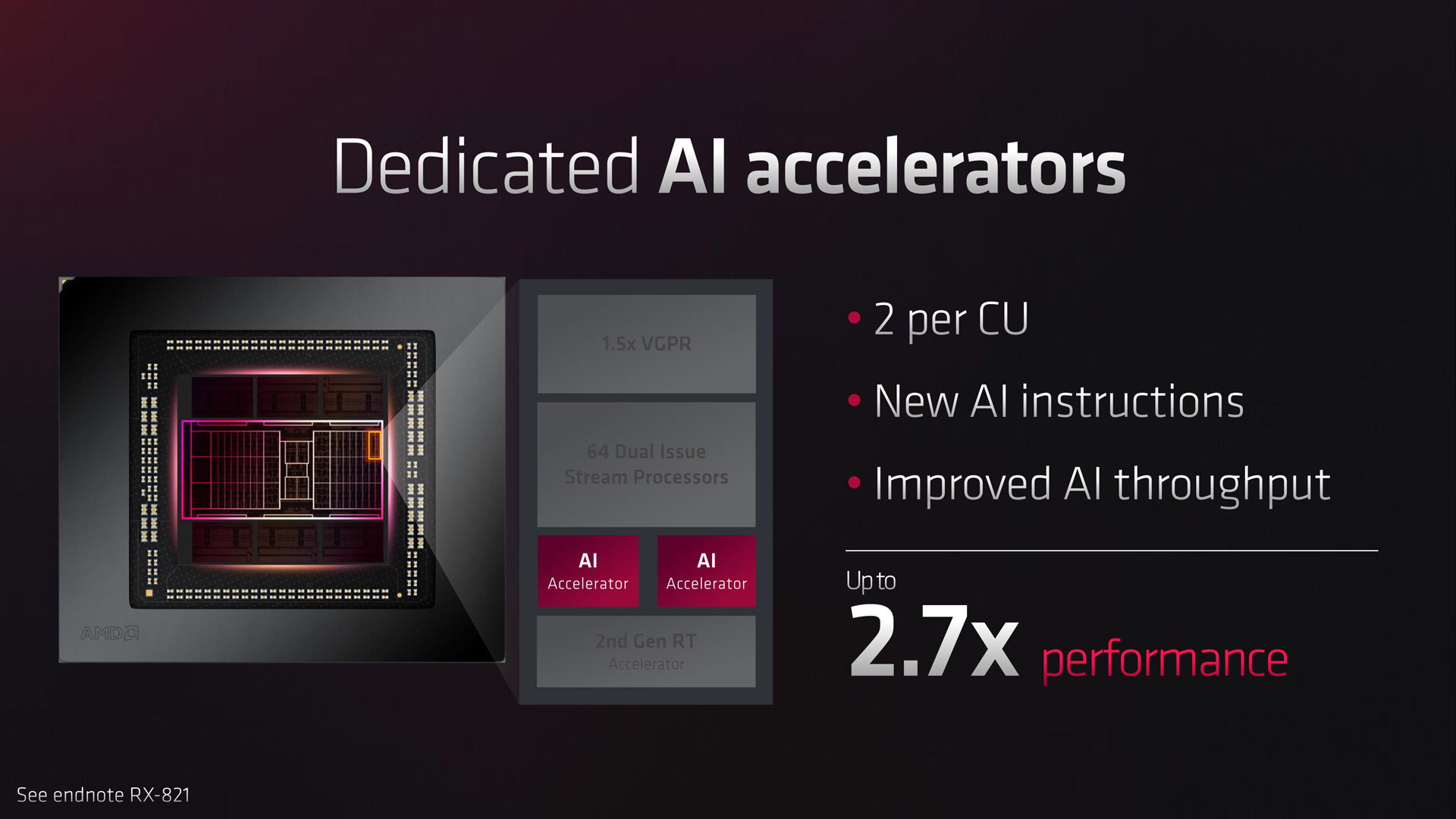 The Compute Unit has also been revamped, with AMD claiming a ‘gaming-optimised' approach. Foremost among this is the switch to Dual Issue Stream Processors, with each shader able to execute both floating point or Integer operations, so AMD claims a ‘2x' improvement to instruction issue rate. For the first time in an AMD GPU, the RDNA 3 architecture now includes AI Accelerators, with two per CU, while a second generation RT Accelerator is also deployed per CU. We only have a very high level overview of the new design for now, but we will follow this up with more information when possible.