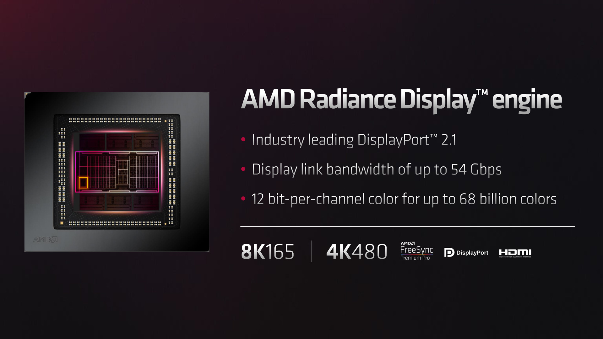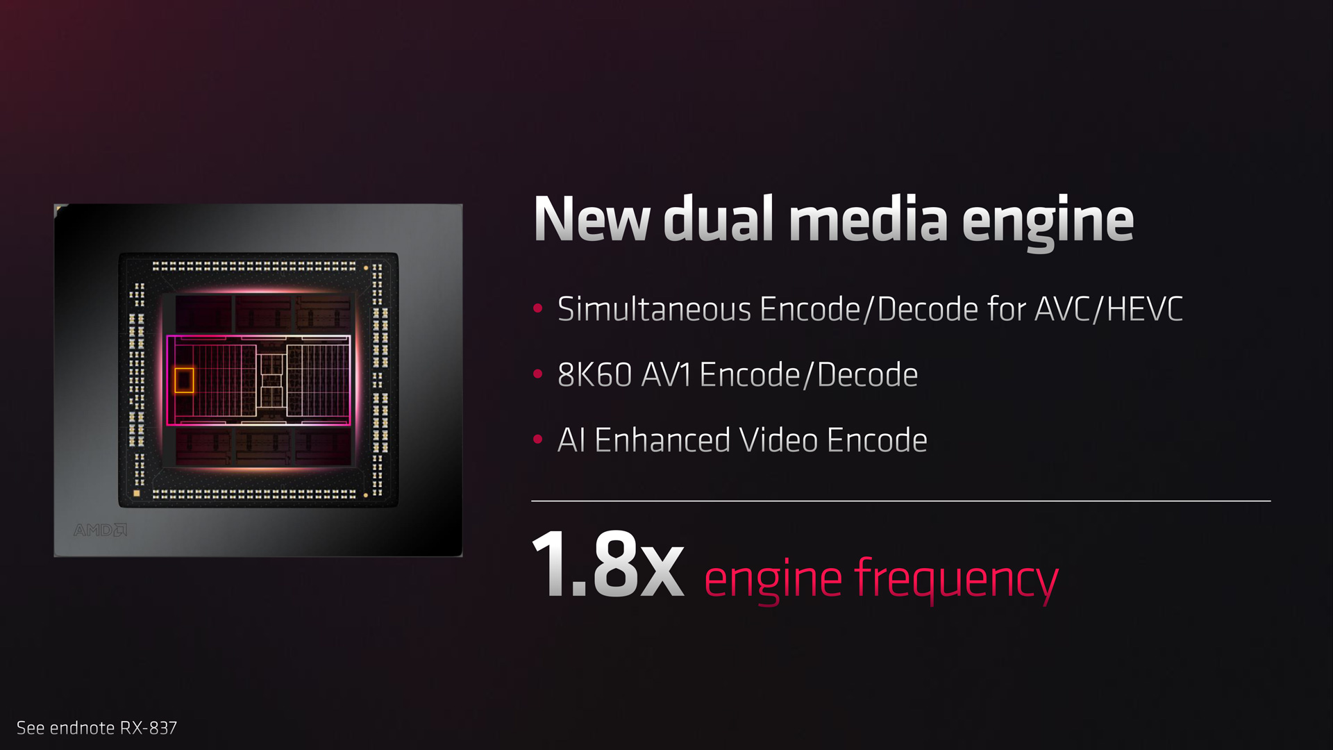 Lastly, a new ‘Radiance Display Engine' is present with RDNA 3, the highlight of which includes support for DisplayPort 2.1 – the first displays of which are reportedly on track to launch next year. A dual media engine is also present, including support for AV1 encode, with simultaneous encode and decode a possibility for AVI and HEVC.