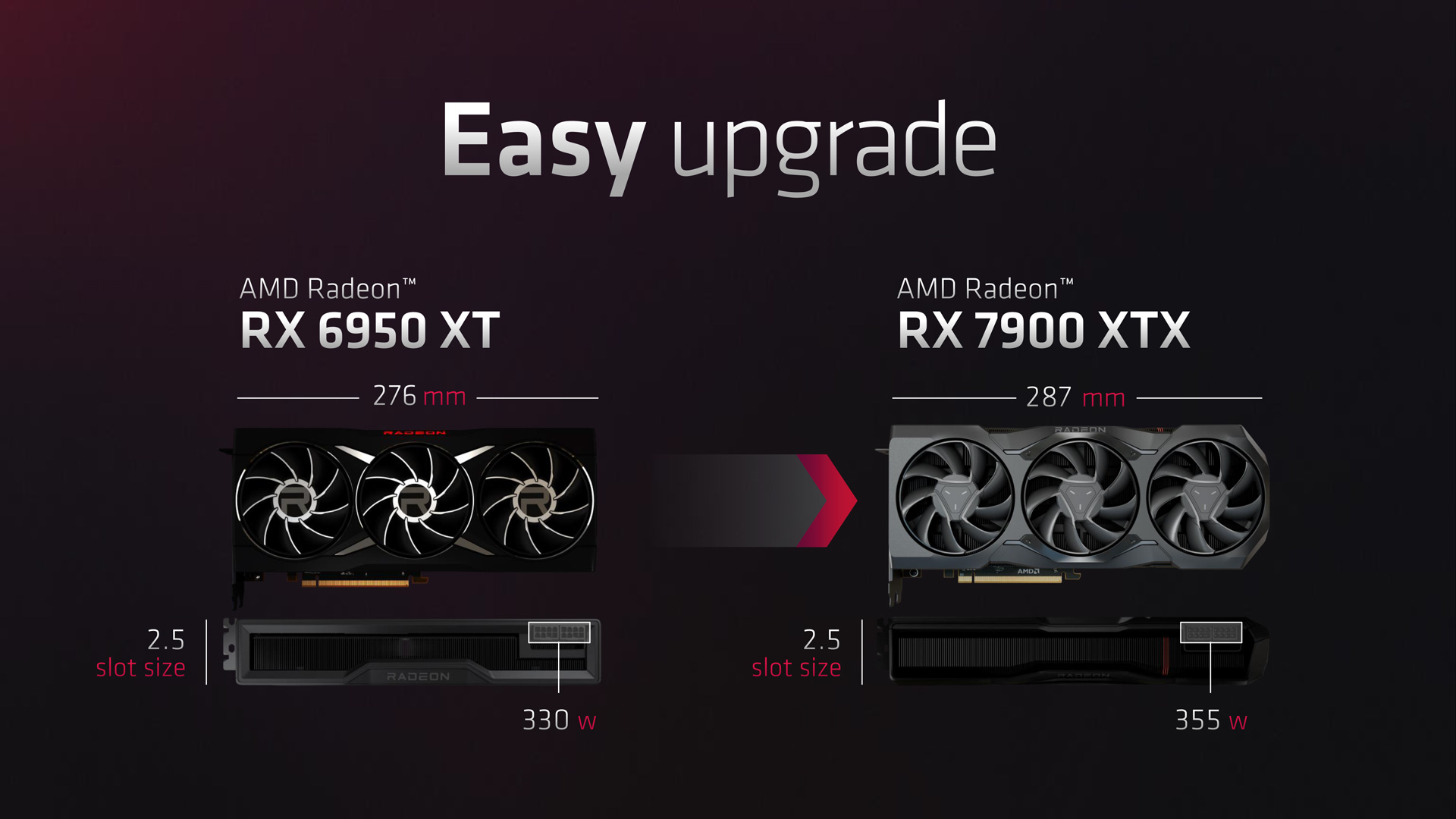 AMD is also keen to emphasise the ‘standard' nature of the new reference card design. Making several thinly-veiled jabs at the RTX 4090, the company points out the dual 8-pin PCIe power inputs – instead of the newer 12VHPWR connector – while the 7900 XT measures 287mm long with a 2.5 slot thickness. So no power adapters needed and it should fit in all but the most compact of ITX chassis.
