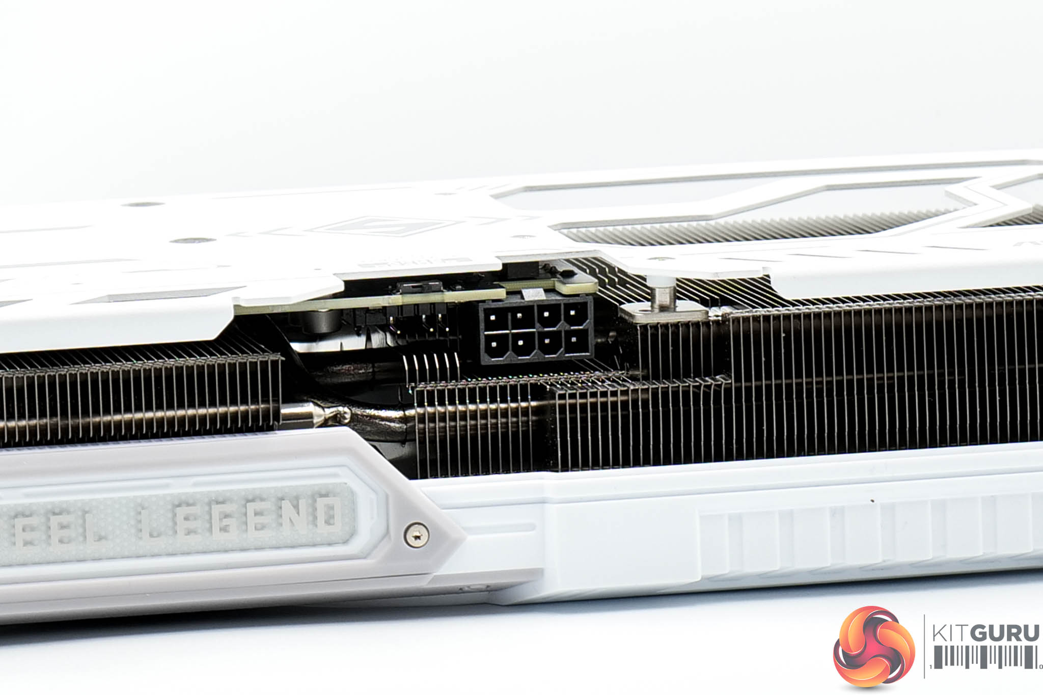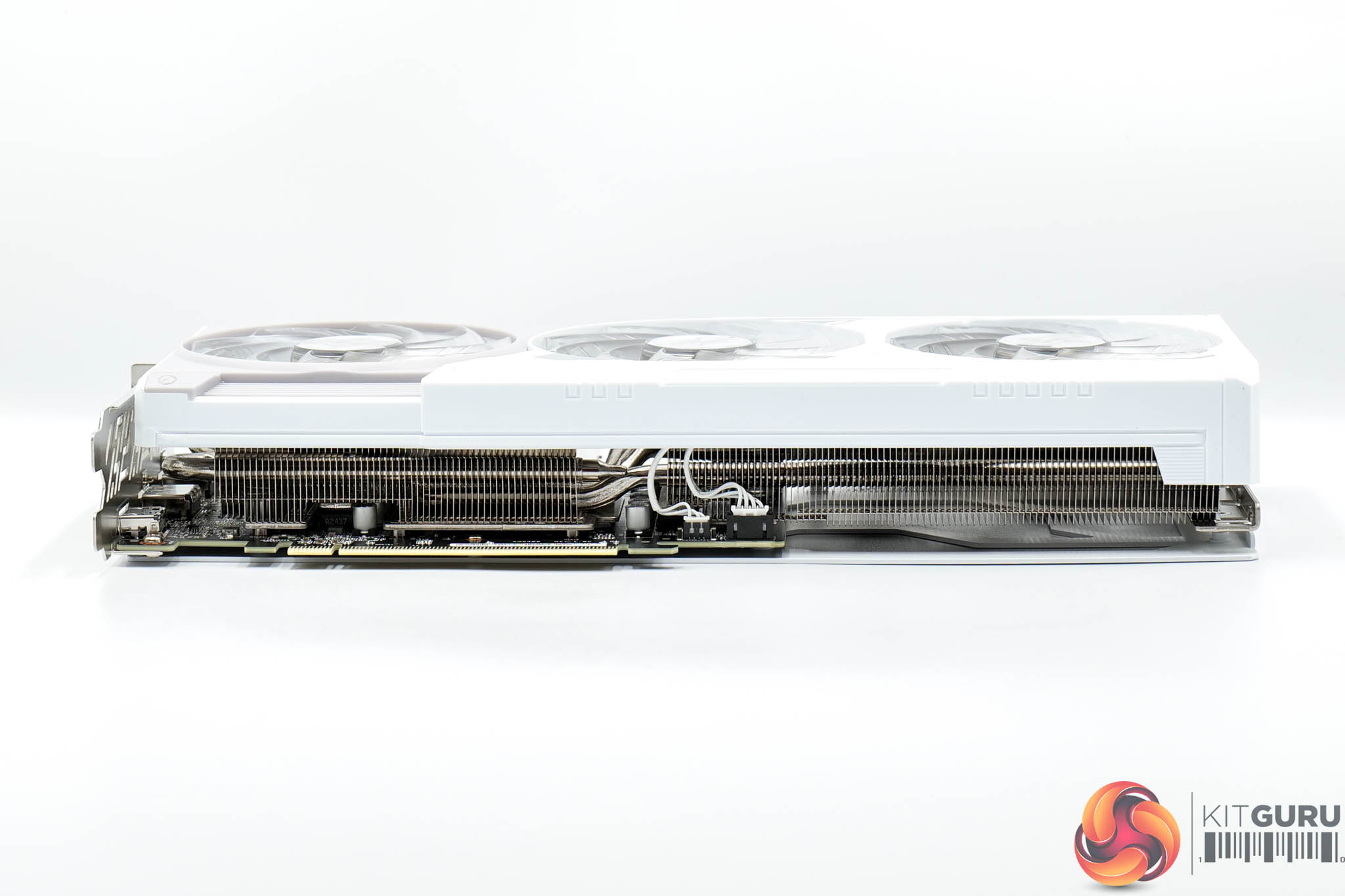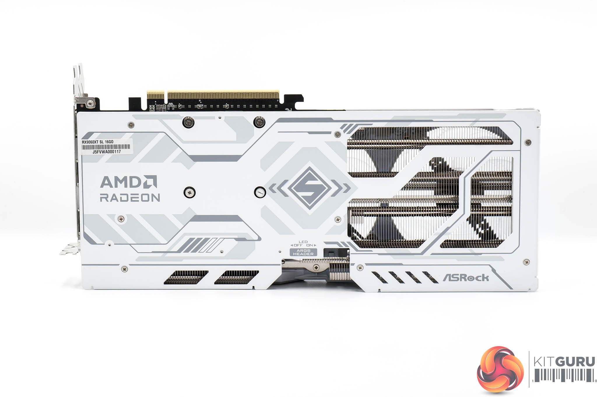 The metal backplate continues the white and grey aesthetic from the shroud, while there's a large flow-through area too. You can also note a physical switch to toggle the ARGB lighting on or off, alongside an ARGB header to control the LEDs externally.