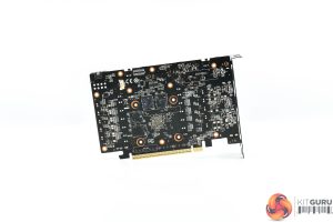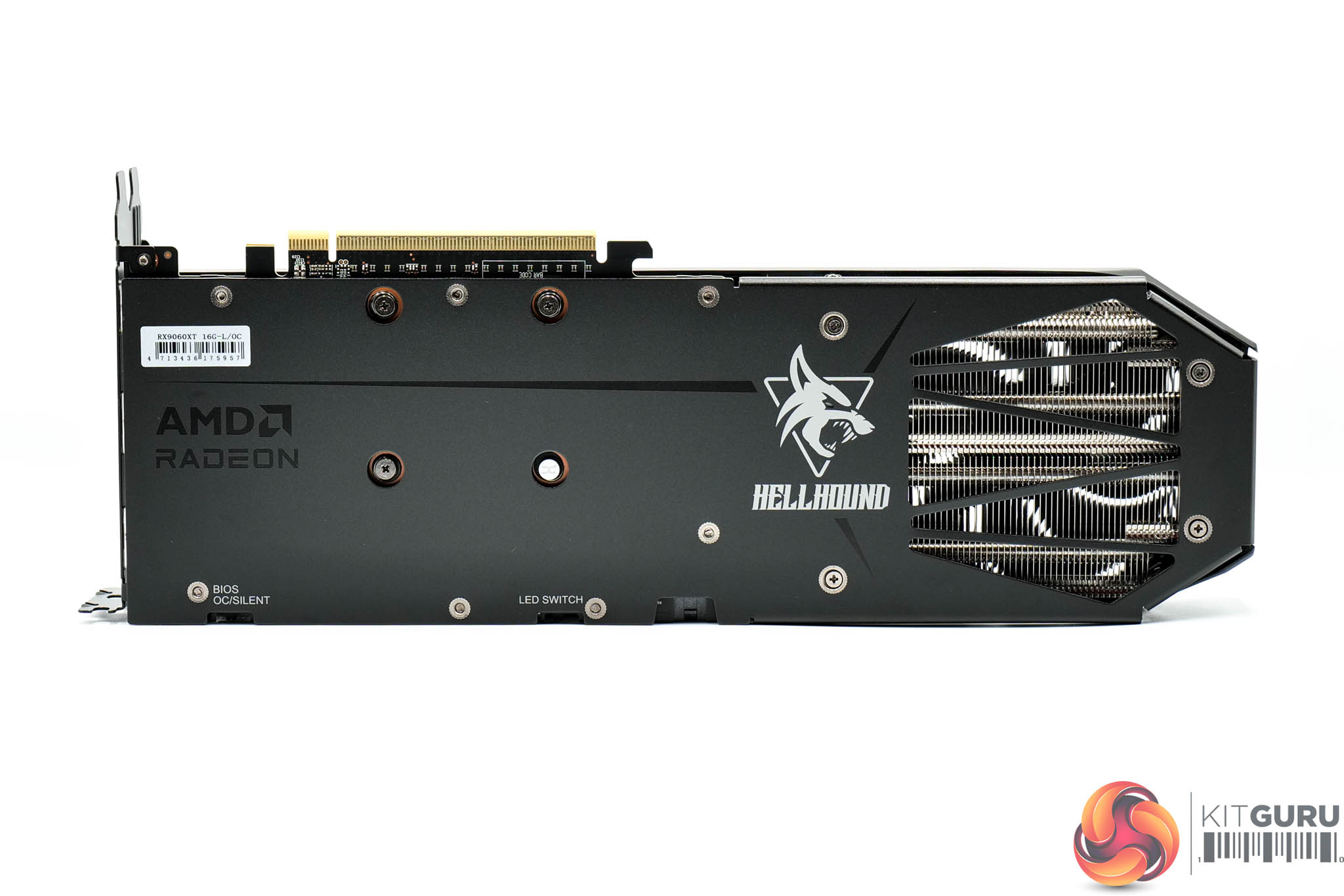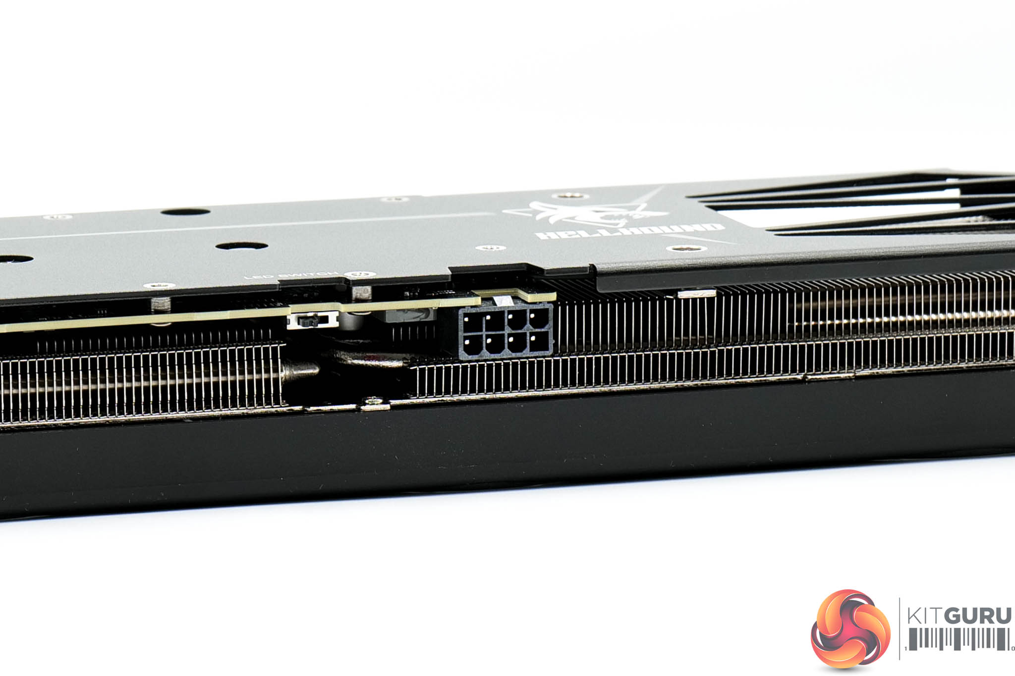 As for the metal backplate, it's also fairly plain, though the Hellhound logo does add some visual interest, plus there's a flow-through area too. You will also note a BIOS switch, offering a choice of OC or Silent modes, plus there's an LED toggle switch.
