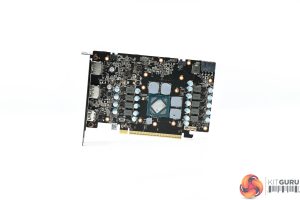 The Hellhound's heatsink utilises a total of four heatpipes, with the GPU and memory contacting with a central baseplate, while the MOSFETs are cooled by secondary plates.
