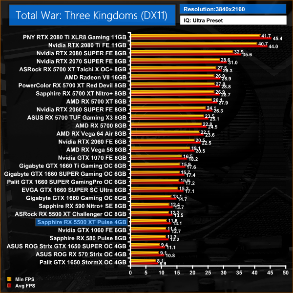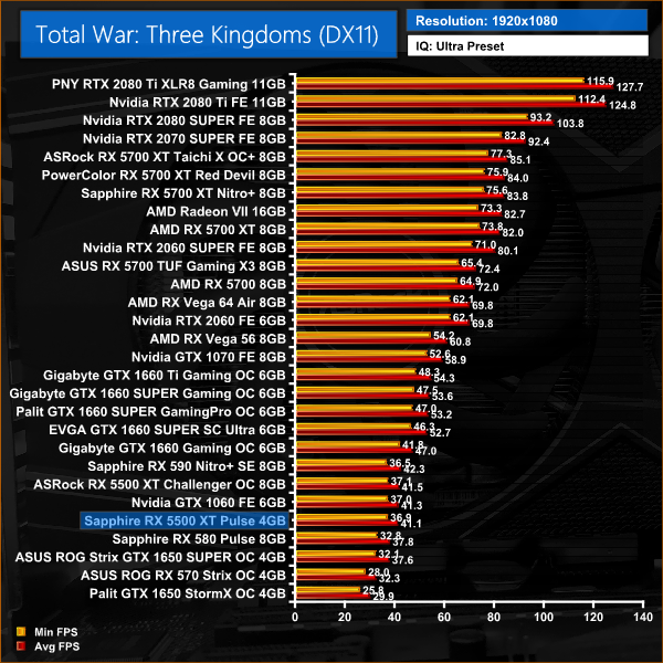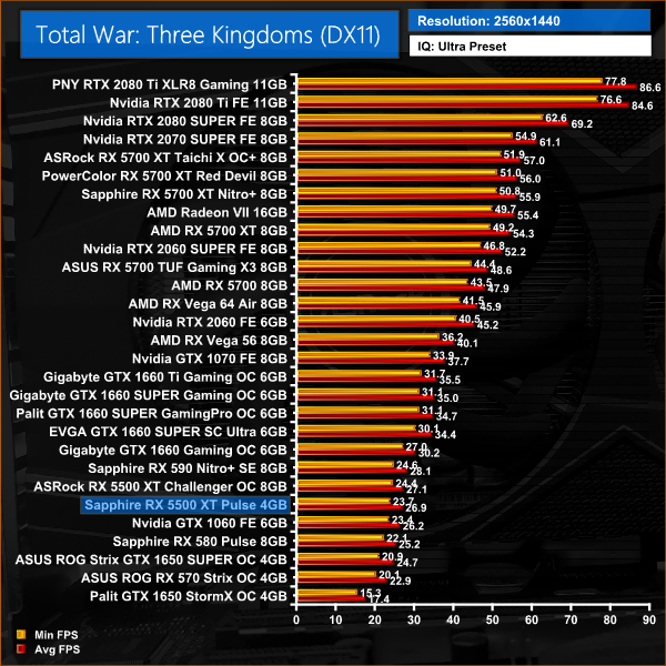 Rounding off our games testing, after falling a fair way behind GTX 1650 SUPER in Shadow of the Tomb Raider, things go the other way in Total War: Three Kingdoms – the 4GB 5500 XT takes a 9% performance lead at 1080p.