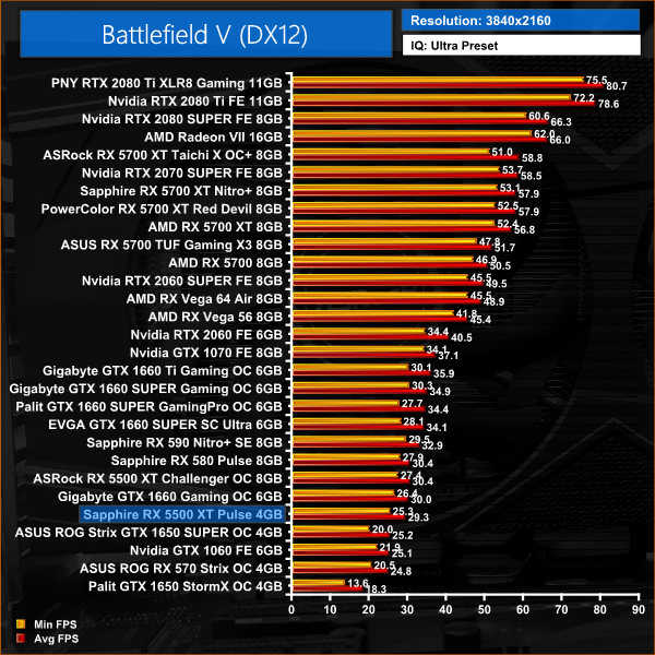 Our first game of the day is Battlefield V, and here we see the Sapphire 5500 XT 4GB coming in 2% faster than the ASUS Strix 1650 SUPER at 1080p resolution.