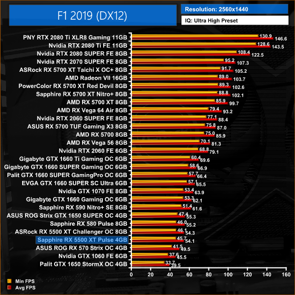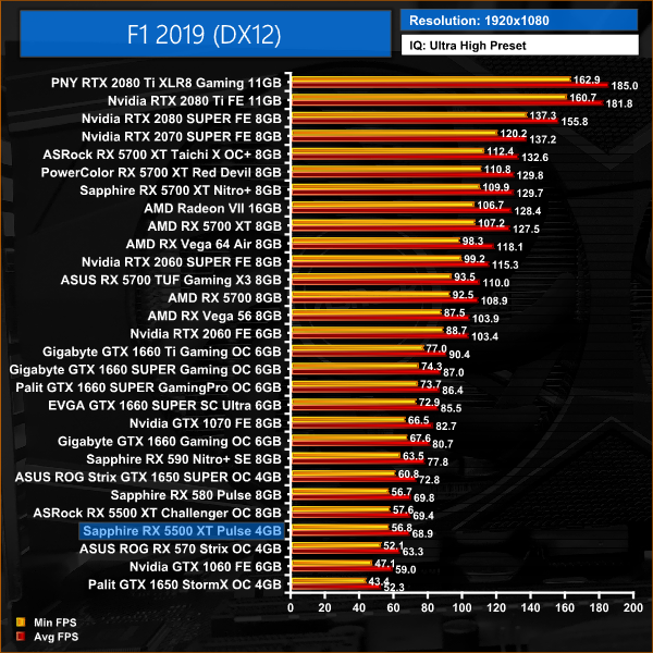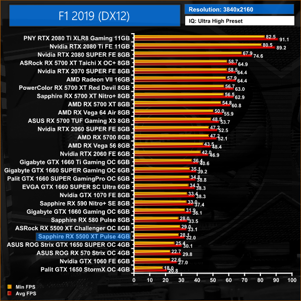 The Sapphire 5500 XT falls slightly further behind GTX 1650 SUPER when testing F1 2019, but the 5% performance deficit works out at a difference of just 3.9FPS.