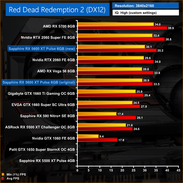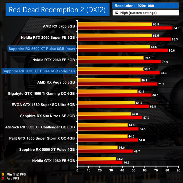 Red Dead Redemption 2 is another interesting title to look at. At 1080p, the 5600 XT with original BIOS was only 2% behind the the RTX 2060. Updating the BIOS gave the card a 10% performance boost, so it came in 8% above the RTX 2060 and only 3% behind the 2060 Super.