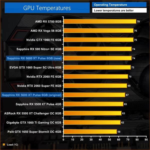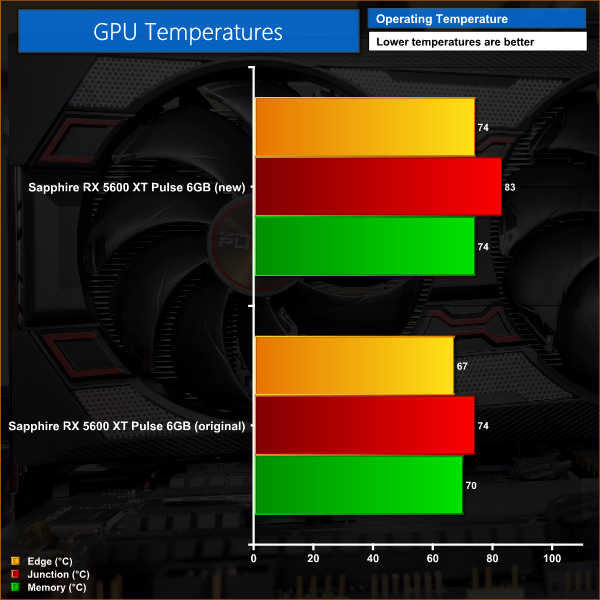 As for temperature testing, it's again fascinating to compare the Pulse's results from before and after the BIOS update. Results before the update are stellar, with a 67C edge temperature and 74C junction temperature. Naturally, these do increase up to 74C and 83C, respectively, once the card is operating with higher clocks and power target, but those are still very respectable results.