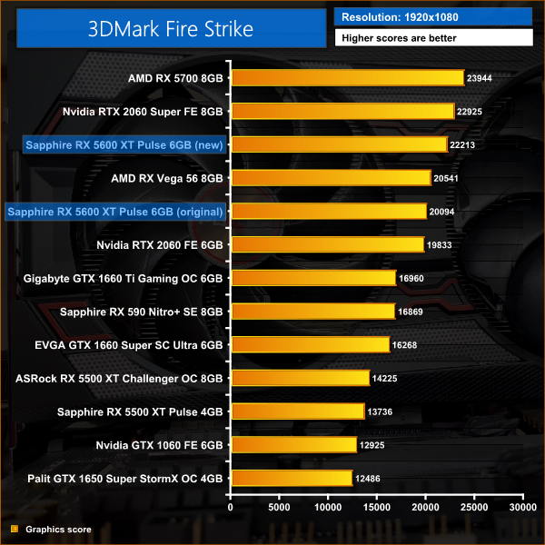 With the 1080p Fire Strike strike benchmark, both the original and new 5600 XT BIOS out-scored the RTX, which is not bad at all. In Time Spy, however, the original 5600 XT BIOS was 9% slower than the RTX 2060, but with the BIOS update there is now parity between the two cards in that benchmark.