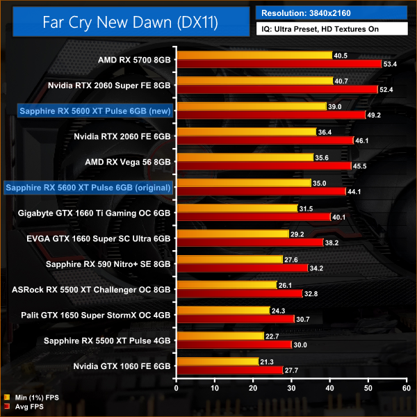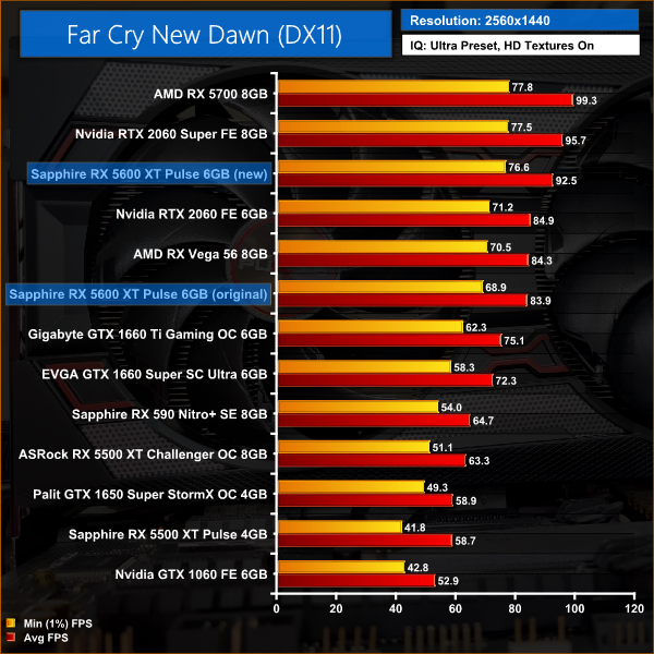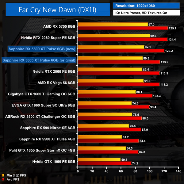 Far Cry New Dawn provides more interesting results, here at 1080p we can see the 5600 XT with original BIOS effectively tied with the RTX 2060, with less than a single frame in it. Once the BIOS was updated, though, this turned into a 6% performance advantage for the 5600 XT.