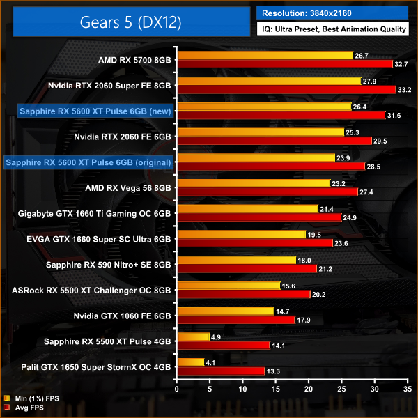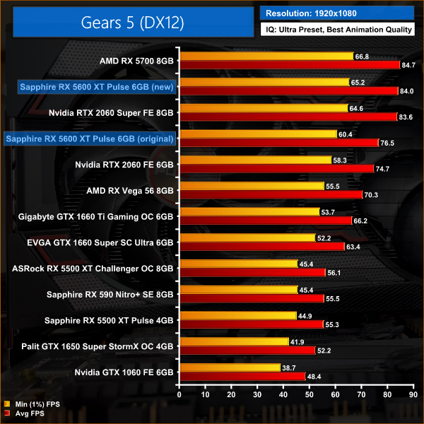 So far things have looked pretty rosy for the 5600 XT with the games we've tested, and it's no different in Gears 5. This is an AMD title so at 1080p it's not a huge surprise to see the 5600 XT original BIOS 2% ahead of the RTX 2060 already, and with the updated BIOS this stretches to a 12% lead, above even the 2060 Super.