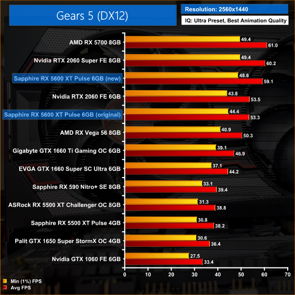 At 1440p, too, the updated BIOS is able to score 10% higher frame rates than the RTX 2060, indicative of an 11% improvement in performance when compared the original 5600 XT BIOS to the updated one.