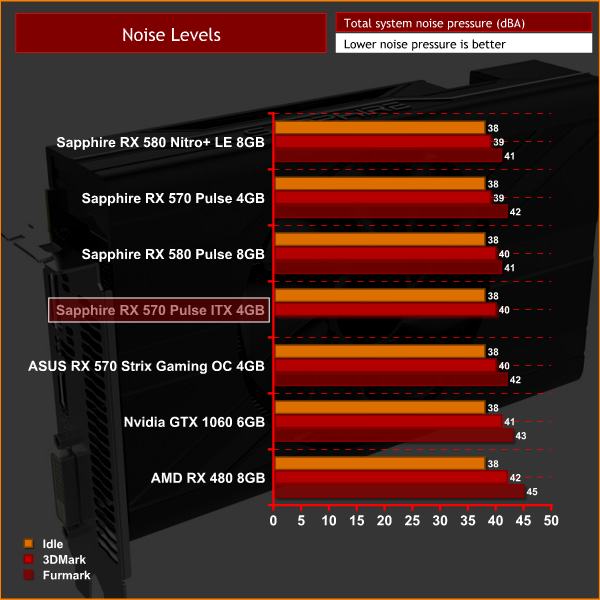 I don't have a result for FurMark as the RX 570 Pulse ITX card underclocked itself significantly to avoid damage, so its noise level reading was not representative of its performance under load. However, it peaked at 40 dBA in Fire Strike, and I measured a peak of 42 dBA during Grand Theft Auto V. These figures put the ITX card in the middle of chart, and it is definitely a whole lot quieter than AMD's reference RX 480.