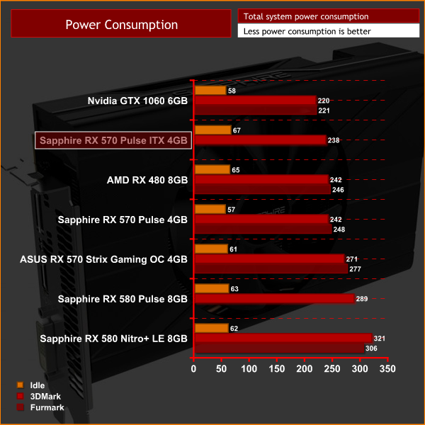 While there is again no result for Furmark, a peak power draw of 238 Watts during Fire Strike is good enough to take the Pulse ITX card to second place in our chart. This is very important for a SFF/ITX card and it is good to see it excelling here.