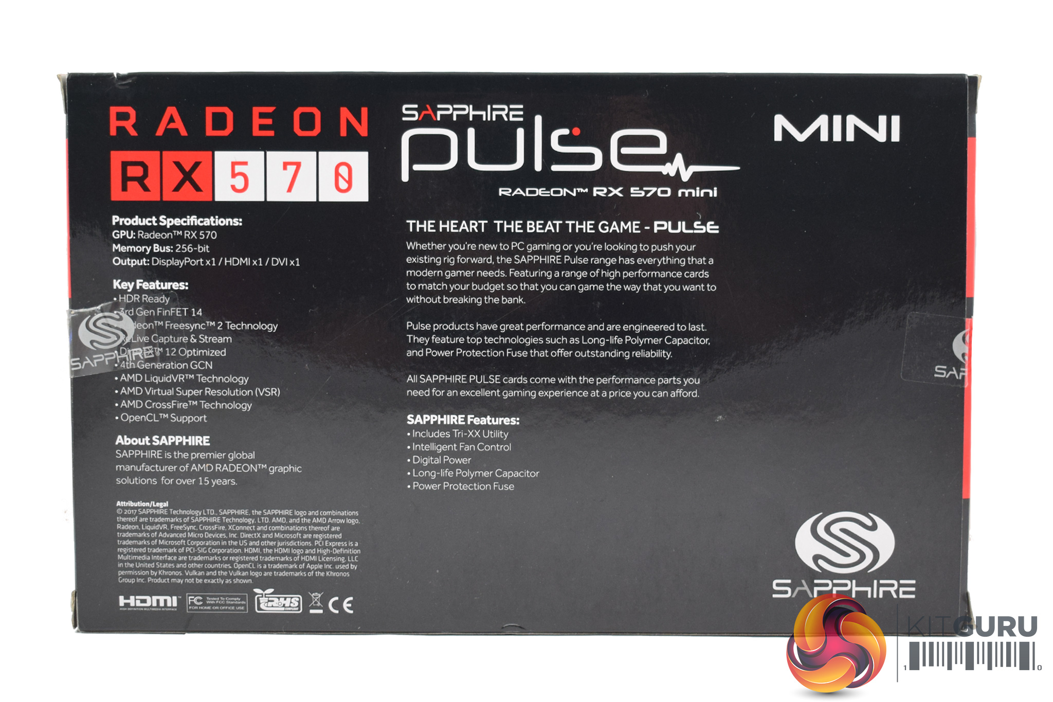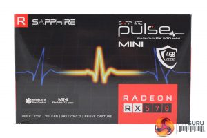 The Sapphire RX 570 Pulse ITX ships in a nearly all-black box. There are no product photos on the front, but we do get more of the EKG graphs that we have seen previously from other Pulse cards.