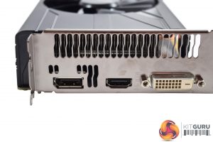At the other end, we can see that the display outputs consist of 1x DisplayPort, 1x HDMI and 1x DVI connector. There is also a large ventilated section above the display outputs to help heat escape from your chassis.