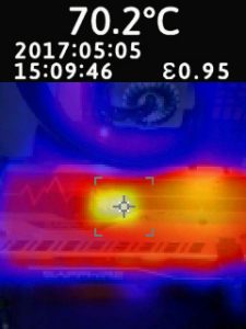 Using our thermal imaging camera, I observed a hotspot behind the GPU core peaking at just over 70C. This is the area where there is a small backplate cut-out, so we are looking right onto the back of the PCB. The rest of the PCB stayed visibly cooler.
