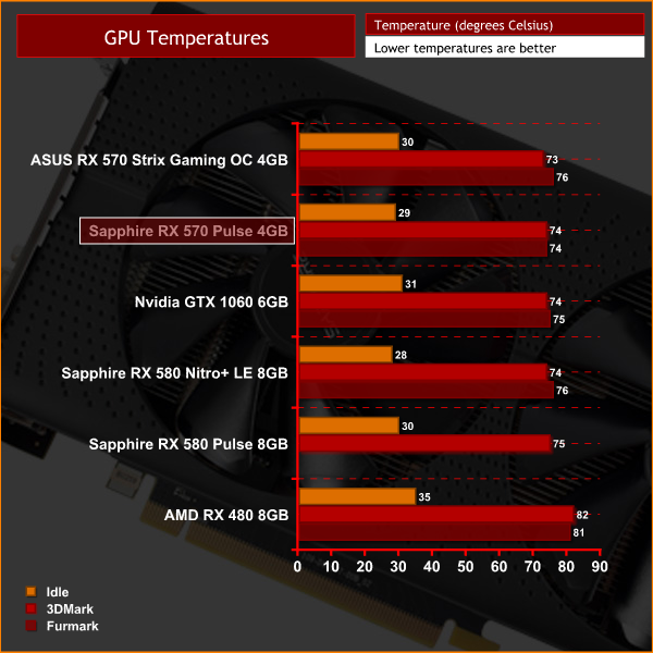 Temperatures were measured after 5 minutes of load under three scenario: Furmark, Fire Strike and desktop idle in sequential order with 2 minutes of downtime in between each test. GPU-Z was used to record the maximum temperature, fan profiles on GPUs were left to their default behaviour.