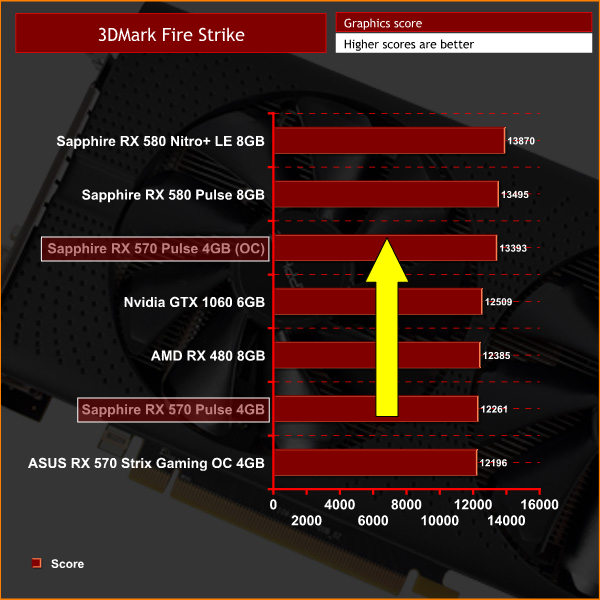 This overclock brought tangible benefits in Fire Strike, with the overclocked score rivalling that of the RX 580 Pulse card. This is a 9% score increase.