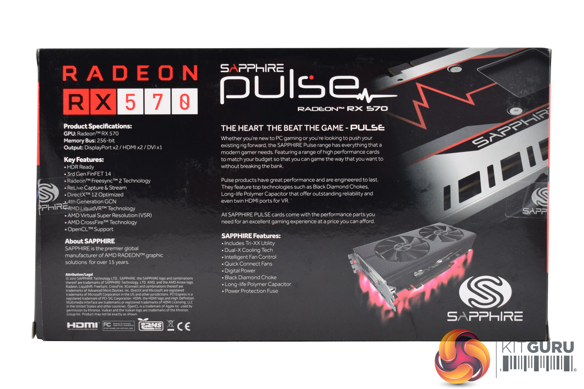 The Sapphire RX 570 Pulse ships in a dark box, with no product photo on the front. However, there is a EKG ‘pulse' graph which obviously ties into the series name.