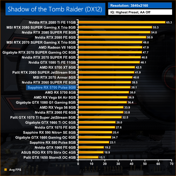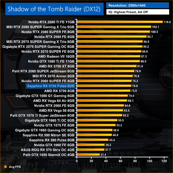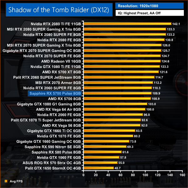 Our last game on test today pretty much sums up overall performance of this card perfectly – with the Pulse RX 5700 coming in 2% faster than AMD's reference card.