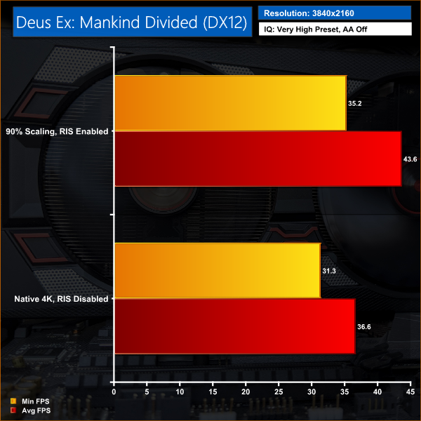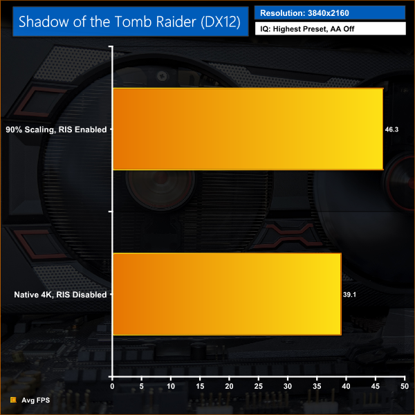 Below, we tested two titles at native 4K, and then again with a custom 90% resolution scale with Radeon Image Sharpening enabled, to see the performance uplift.