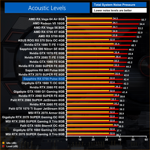 Just to give some extra context for these results, these readings under load came with the Pulse RX 5700 running its fans at at 44%, or 1430rpm. When idling, the fans stop spinning completely.