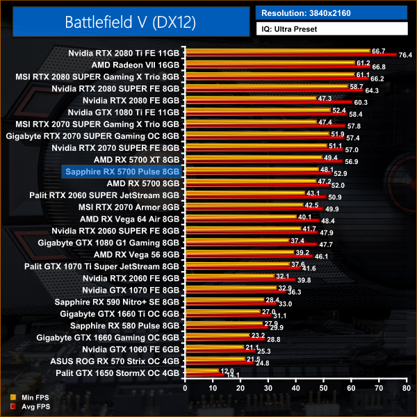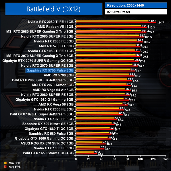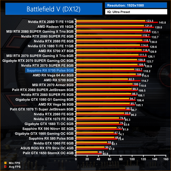 Battlefield V follows the initial trend we saw from 3DMark, with the Pulse RX 5700 again outperforming the reference card by 2% in this title. That is – at most – a difference of 3.5FPS at 1080p.