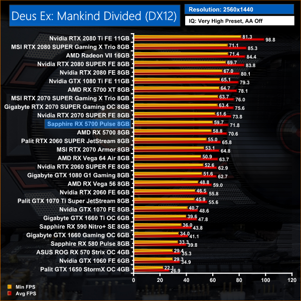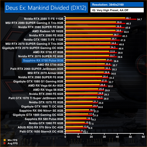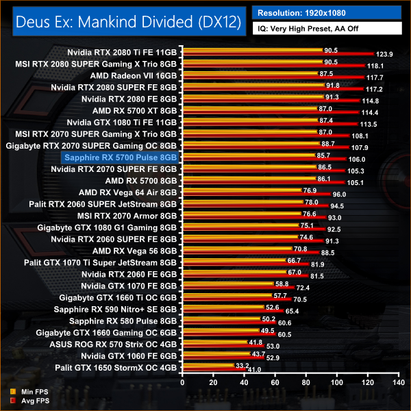 Deus Ex: Mankind Divided – along with Battlefield V – is one of our most AMD-friendly games and the RX 5700 outperforms the RTX 2060 SUPER across the board. We again see the Pulse card averaging 2% higher frame rates than AMD's reference design.