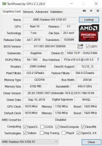 To recap the core spec of the RX 5700 XT, the GPU is based on TSMC’s 7nm process and is made up of 40 Compute Units, each housing 64 Stream Processors for a total of 2560 shaders. Alongside that, the card is outfitted with 8GB of GDDR6 memory, operating over a 256-bit bus for 448GB/s total memory bandwidth.