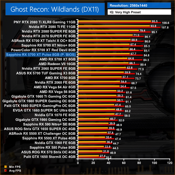 Wildlands sees very similar performance between this Pulse, the reference 5700 XT and the 2070 SUPER – at 1440p, there's not even 3FPS difference between all of those cards.