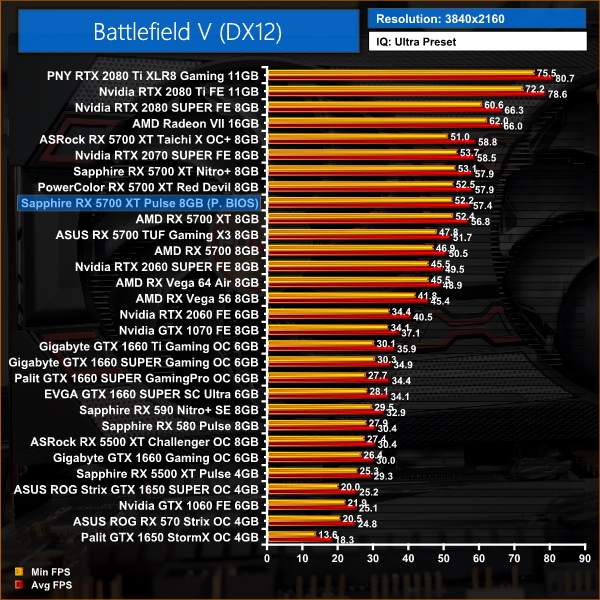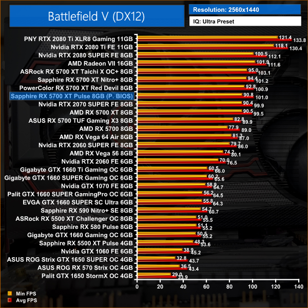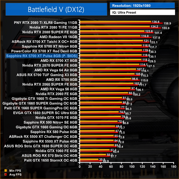 In our first game of the day – Battlefield V – we again see no more than 2% performance gains over AMD's reference card. At 1080p, the Pulse 5700 XT is 2% faster than Nvidia's RTX 2070 SUPER.
