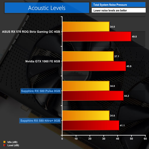 There is no doubt that the Nitro+ is the quieter card. The Pulse isn't loud – compared to the ASUS RX 570, for instance, it much easier on the ears – but the Nitro+ is simply one the quietest graphics cards I have ever tested.
