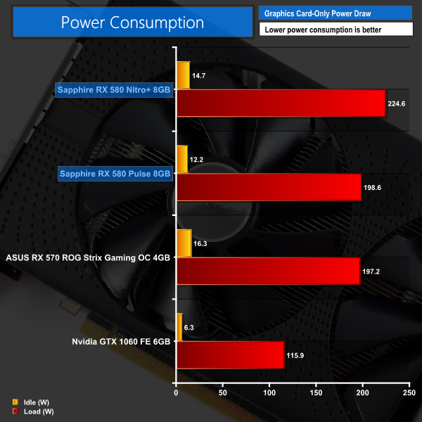 The difference between the two Sapphire RX 580s? Exactly 26W under load. Everyone will prioritise power draw differently, but let's put that figure into perspective. For instance, I pay 12.86p per kWh to my electricity supplier. Say I game on my PC for three hours a day, all year round – that would mean the Nitro+ costs me £31.65 in electricity. With the Pulse, it would cost me £27.99.