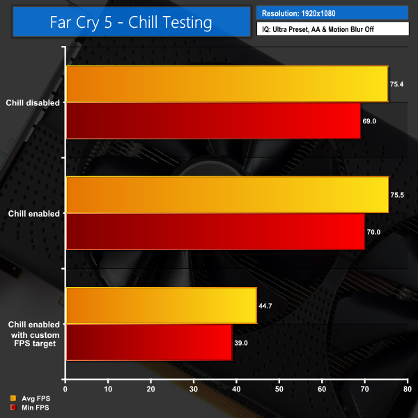 As you can see, having Chill enabled globally does not get the best from the technology. Instead, when you set a custom FPS target for each specific game, it can work wonders. The average FPS in our Far Cry 5 run, for instance, dropped to 44.7 – it would be right around 60FPS while I was running, but about half a second after I'd stopped, it would drop right down to 40. It's quite impressive.