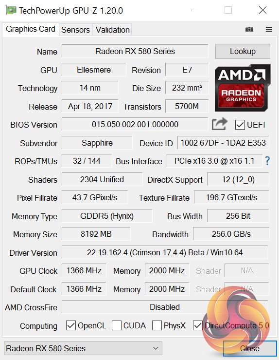 This particular RX 580 partner card has received a modest factory overclock: up to 1366MHz boost, which is an extra 26MHz over reference speeds.