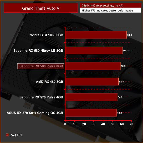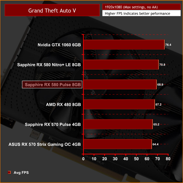 The GTX 1060 opens up a bigger lead in GTA V 5, coming in at 6-8 FPS faster than the Pulse RX 580.