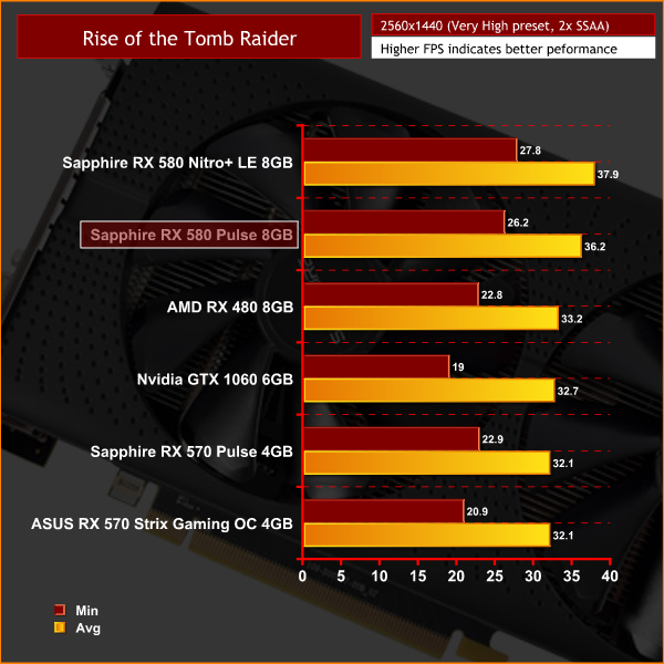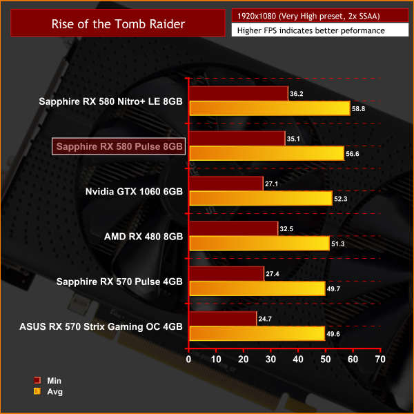 In Rise of the Tomb Raider, the Pulse RX 580 8GB proves to be around 4 FPS faster than its GTX 1060 rival.