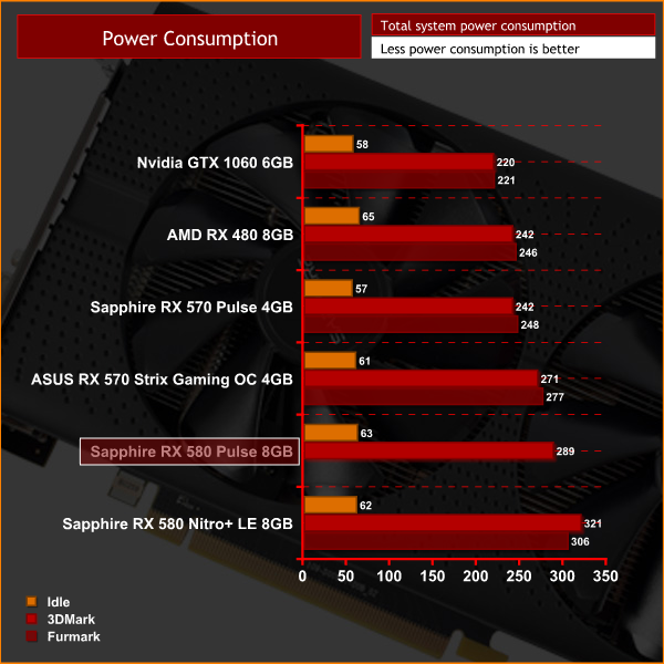 While I did not get a result for FurMark, the 289 Watt power draw reading taken while running 3DMark matches the figures I saw while gaming. This is higher than the reference RX 480 8GB, due to the factory overclock, and is considerably more than the GTX 1060.