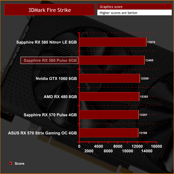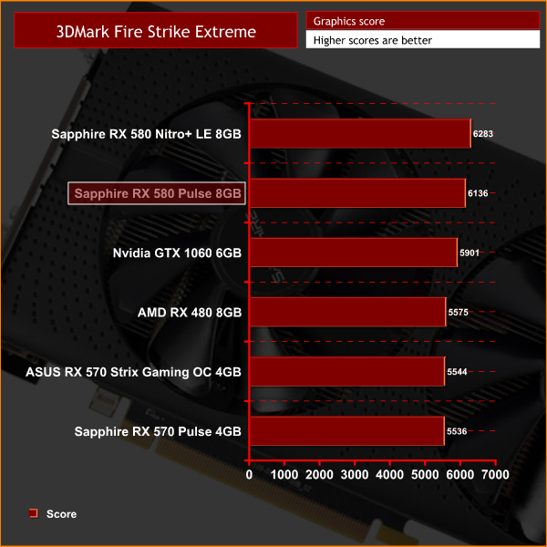 A key battle today will be how the RX 580 Pulse gets on against the Nvidia GTX 1060. In both Fire Strike and Fire Strike Extreme, it takes an early lead. The RX 580 Nitro+ LE is faster still thanks to its higher out-of-the-box clock speed.