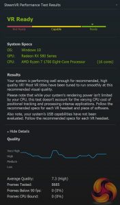 The SteamVR Performance Test measures a system’s rendering power using a 2-minute sequence from Valve's Aperture Robot Repair VR demo. After collecting the data it determines whether a system is capable of running VR content at 90fps and whether VR content can tune the visual fidelity up to the recommended level. For machines that are not VR Ready the tool can help determine whether capabilities are bound by Graphics Card, CPU, or both.