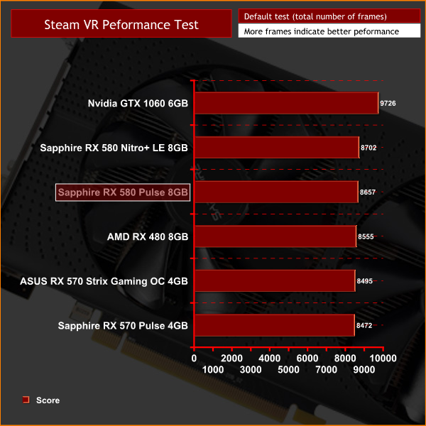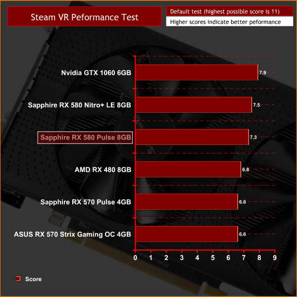 The GTX 1060 comes out on-top in the SteamVR performance tests, though the Pulse RX 580 8GB is still fully VR capable.