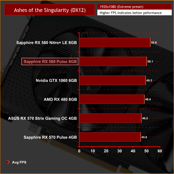 Ashes favours both RX 580 cards, and you can see that the Pulse model is only a couple of frames slower than the more expensive Nitro+ LE card.